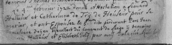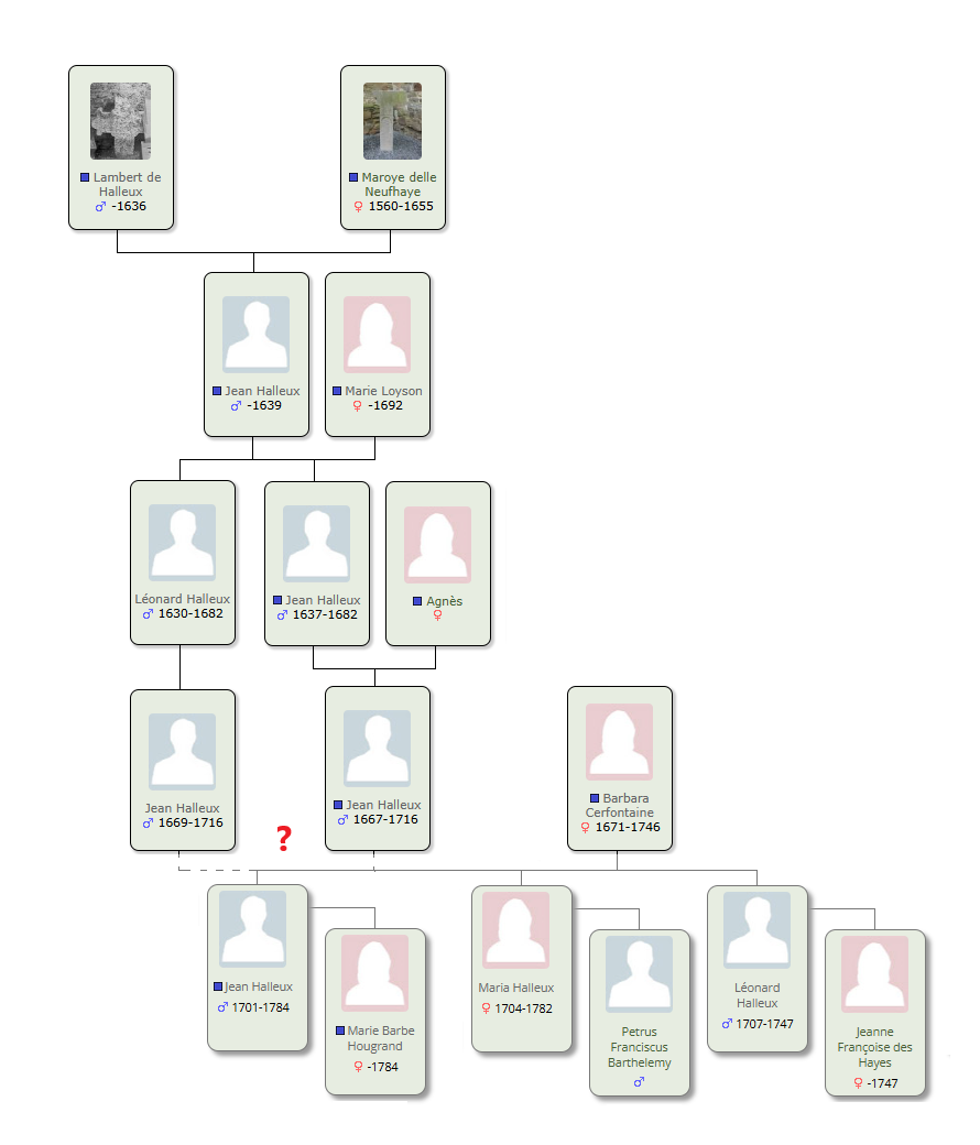 Nous avons parcouru les registres des baptêmes de Saint-Jean-Sart (Aubel) et de Saint-André (Dalhem). Le registre de Saint-Jean-Sart de 1701 mentionne le baptême de Jean, fils de Joannes Halleux et de son épouse Barbara, tandis que celui de 1704 indique le baptême de Maria, fille de Joannes Halleux et Barbara Cloes. Et dans le registre de Saint-André de 1707, on trouve le baptême de Léonard, fils de Joannes Halleux et M. Cerfontaine. On conclut donc que c'est un Jean (Joannes) Halleux qui est le père de Jean, Maria et Léonard et que leur mère est